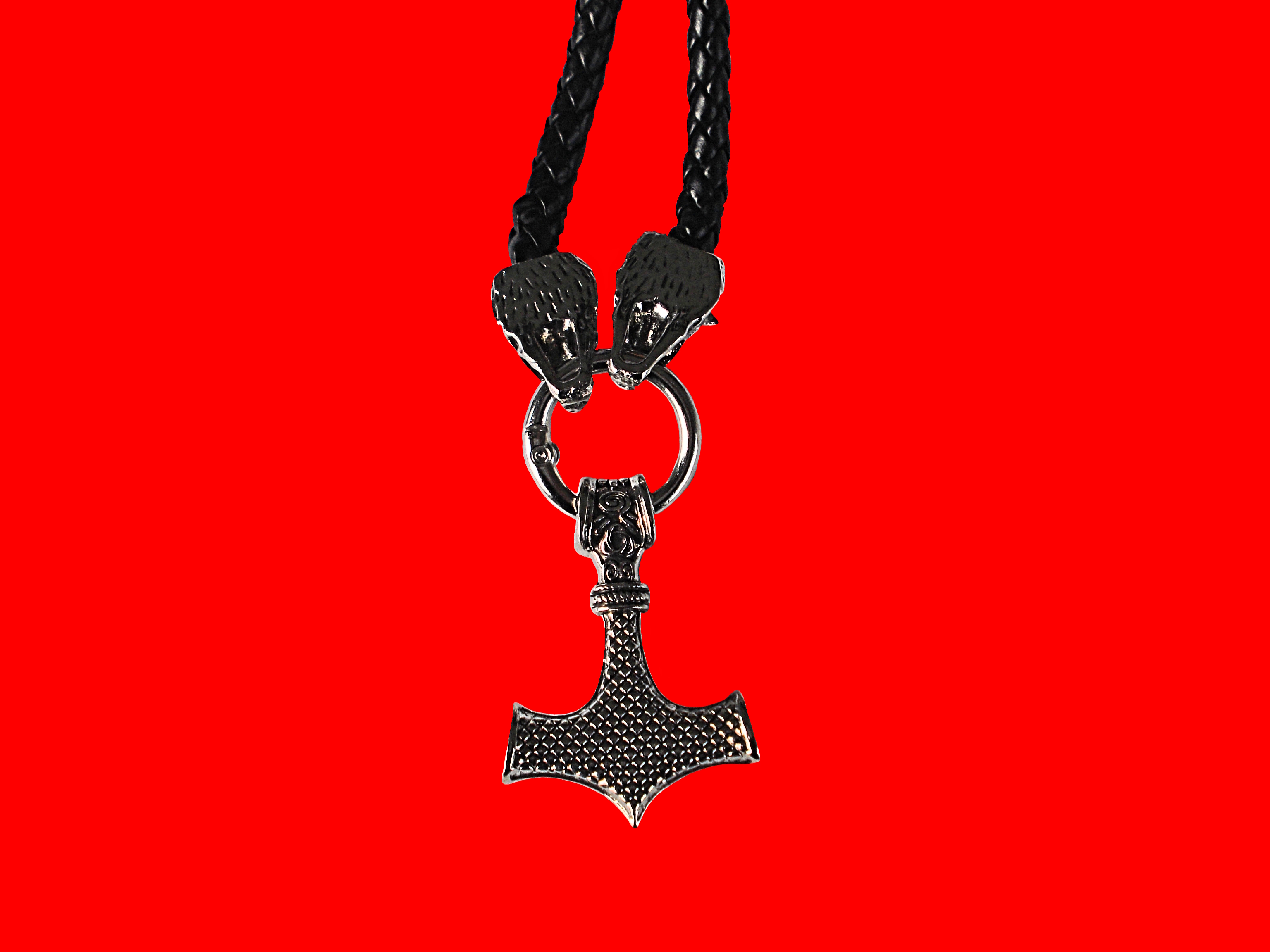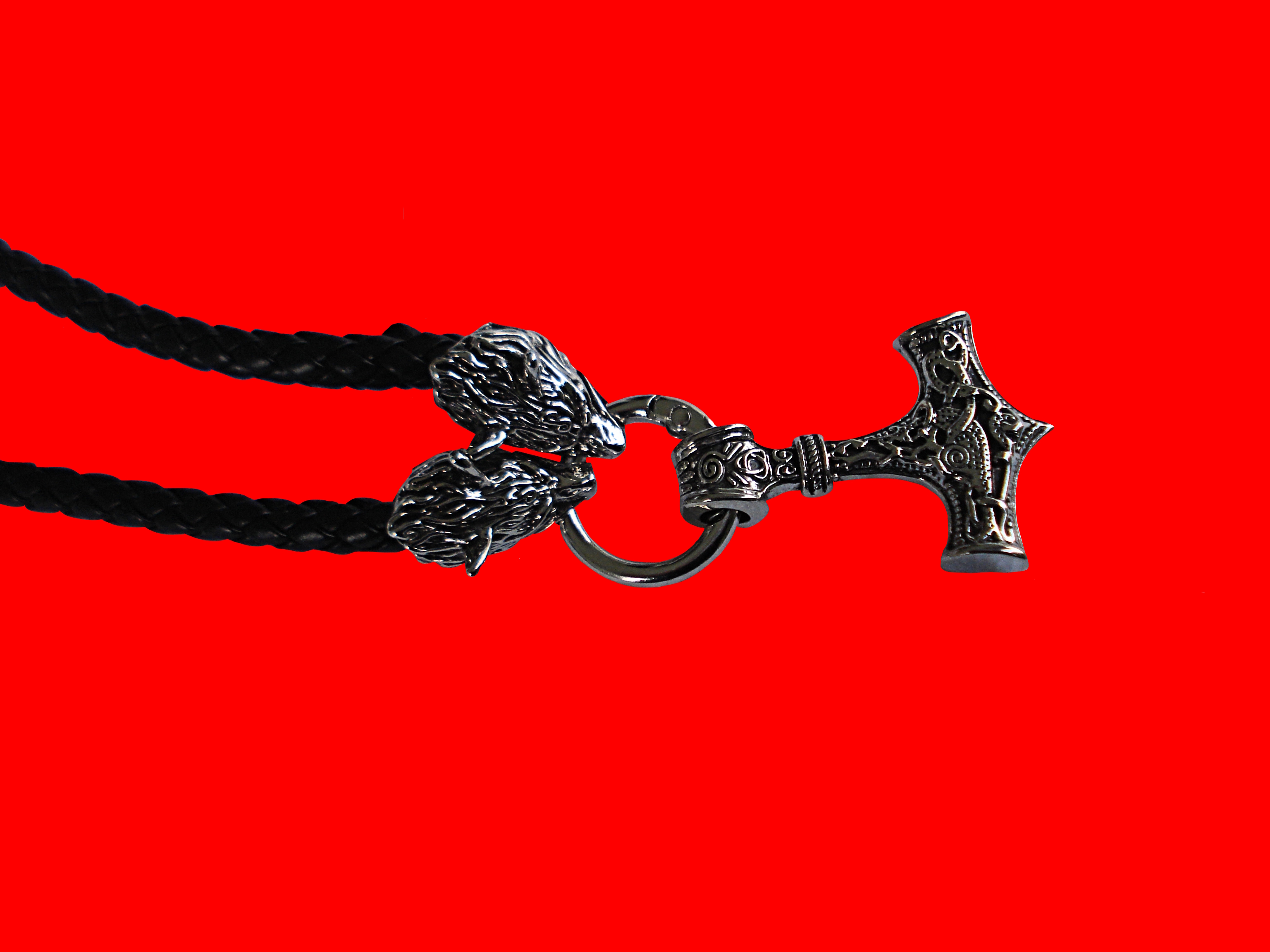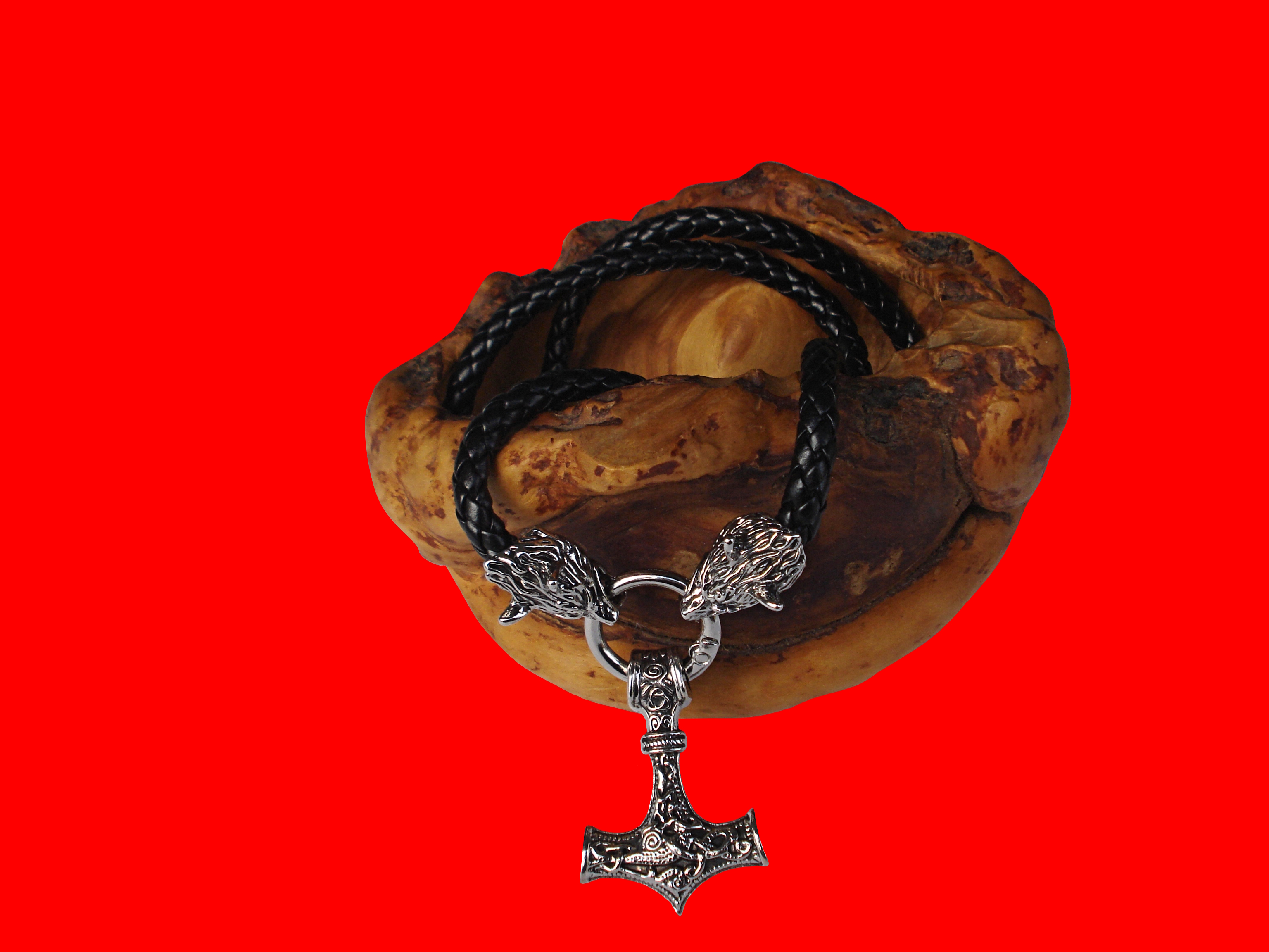 Sehr schön gefertigtes Lederband geflochten in schwarz , mit zwei Wolfsköpfe silberfarben und Anhänger Thorhammer silberfarben.