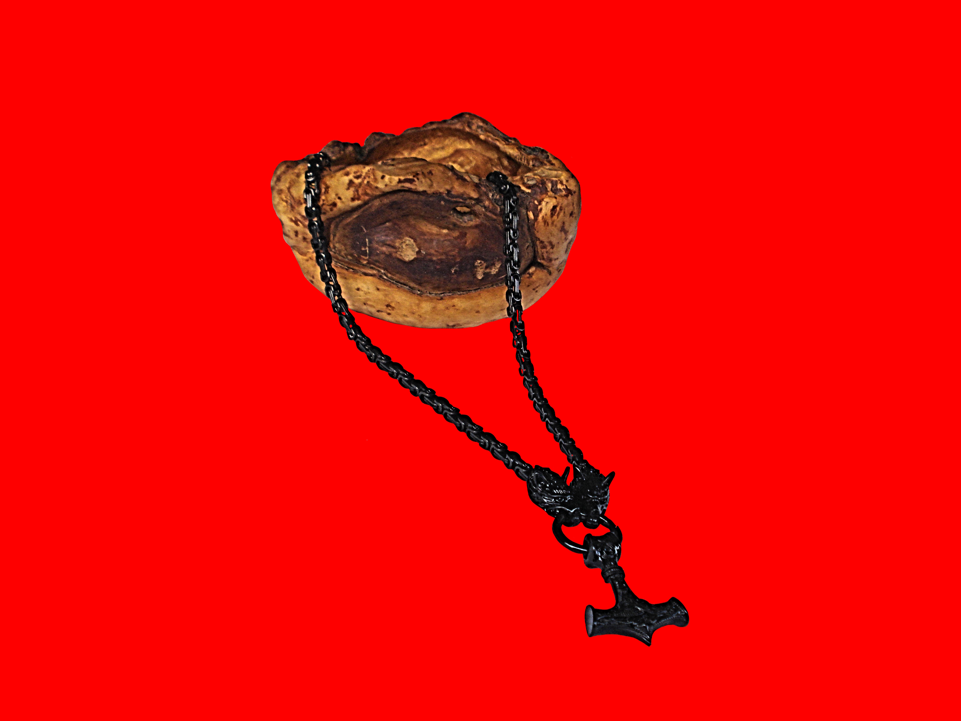Sehr schön gefertigte Gliederkette in schwarz , mit zwei Wolfsköpfe und Anhänger Thorhammer.